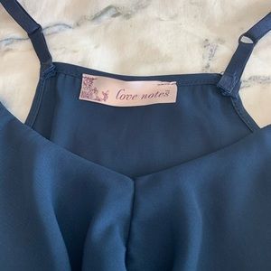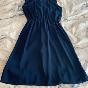 Francesca’s navy ruffle front dress. Size Small - the size tag is no longer attached. It also does not have the belt that came with it but the loops are still attached. You could simply cut them off or add a belt of your choice.