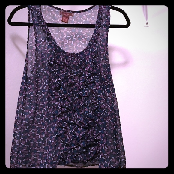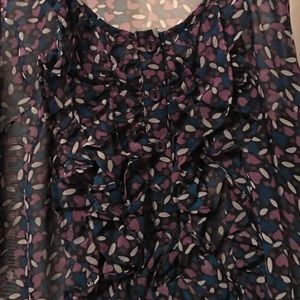 Sleeveless top with ruffle detail and three buttons in front. Colors navy blue, purple, white. Looks cute with a cardigan over and very work appropriate. Sheer, best to wear a camisole underneath. From Nordstrom BP.