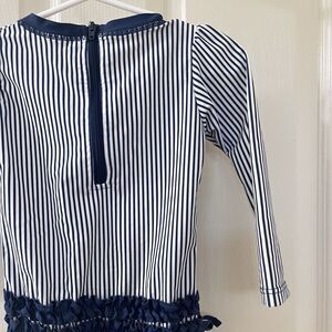 RuffleButts Navy Blue Striped One Piece Rash Guard Swimsuit Size 18-24 Months. Adorable little suit. Back ruffle and side bow details. Has been worn and washed, but no issues that I can find. Good Used Condition.