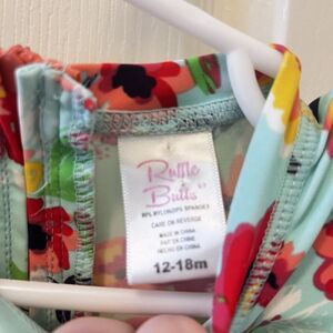 RuffleButts Painted Flowers One Piece Rash Guard Swimsuit Size 12-18 Months. Adorable little suit. Back ruffle and side bow details. Has been worn and washed, there is some paint chips to the zipper and some light wear to the fabric. Still has a ton of life left. Good Used Condition.