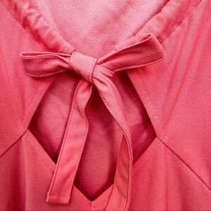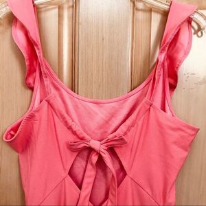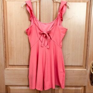 Ruffle straps coral colored romper by Divided H&M Brand. Adjustable straps with back bow tie. Shorts on bottom. Size 10. Material is 93% Polyester 7% Elastane. Good condition.