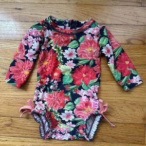 One piece swimsuit. Zip clsoure in back. SPF 50+, long sleeves. snaps at bottom. Bright floral pattern with ruffles on butt.