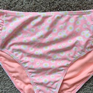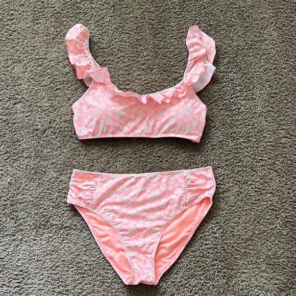 Cabana del sol size large. Light orange with yellow and white flowered bikini set with ruffled top.