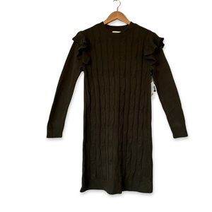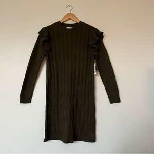 Cozy can be chic with Bar III's soft and sophisticated sweater dress, a classic crewneck design decorated with a cable knit front and playful ruffled shoulders.