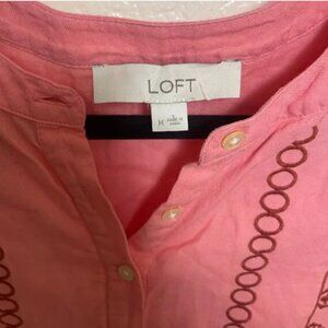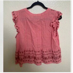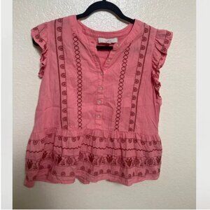 This top is in great condition! Crew neck, button down front, ruffled sleeves. Pink with red embroidered detail, peplum bottom. Lightweight and comfortable, perfect for a spring day!
