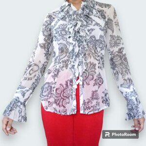 Ruffled Floral Black White Grey Floral Blouse Translucent Tie Up Flare Small