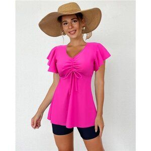 Look stylish and feel confident in this two-piece tankini set. The ruffle tankini top with a drawstring bow and removable padded bra offers tummy coverage and a flattering silhouette. High-waisted boy shorts provide full coverage and comfort for swimming, lounging, or beachside fun.