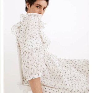 A very pretty dress with vintage-y cottagecore details: a mini floral print, dramatic ruffles and pleats on the sleeves and skirt. Yes, you will probably need to host a picnic so you can show it off.