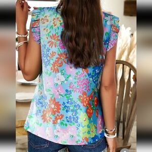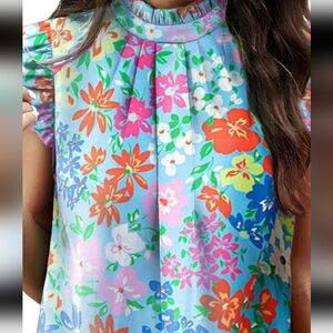 Ruffled Printed Mock Neck Cap Sleeve Blouse
