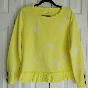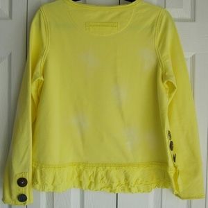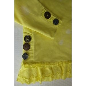 French Terry in bleached yellow. Ruffled hem, unfinished neckline, mixed buttons at cuff and side hem, cotton/spandex blend, 23.5" long from back of the neck to hem. 2 very small stains (dots) on back