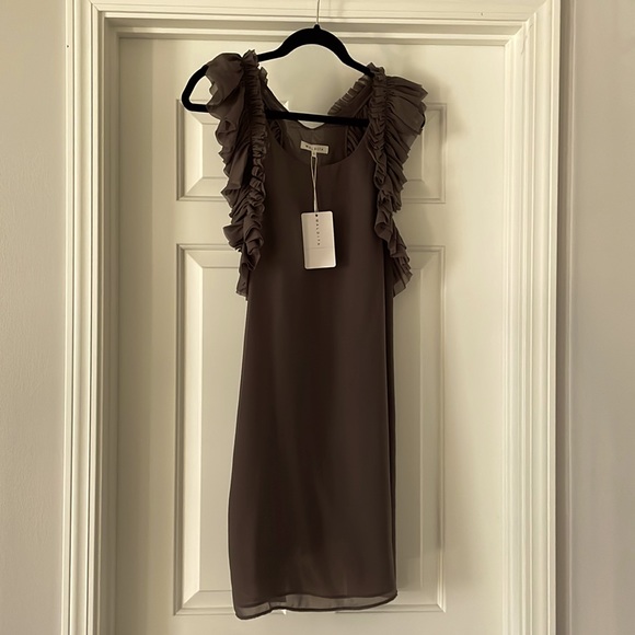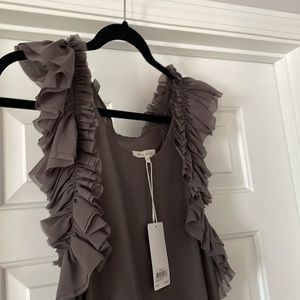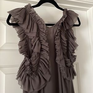 Ruffled racer-back mini dress. Size Large, but runs small. Color: charcoal gray