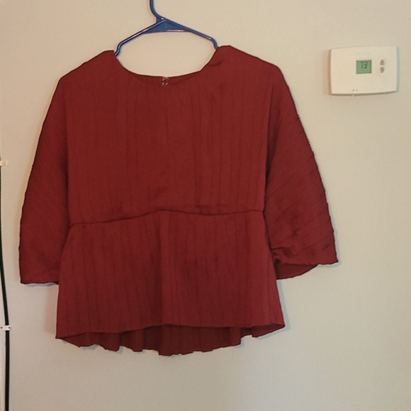 Express, red Blouse with slit in chest and ruffles. Fits like a loose peplum top. Silky material, size SP, worn once