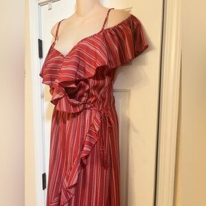 Adjustable spaghetti straps and off the shoulder sleeves. Side tie and ruffles along side slit and bottom. Excellent condition size medium.