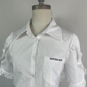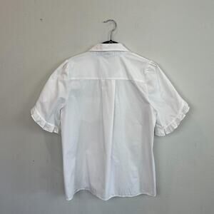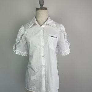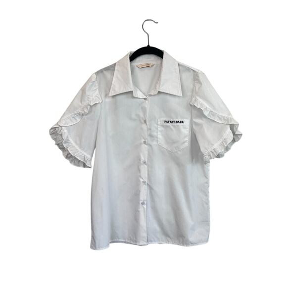 Features: Short sleeved button down with embroidered brand logo on front pocket, back pleat detail, cross-over sleeves with ruffle trim