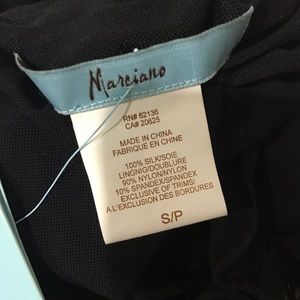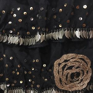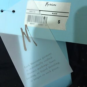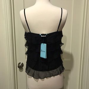 Gorgeous black ruffled tank top by Marciano. New with tags, never worn! Amazing, intricate detailing with rose embroidery, sequins, and tiny little feather charms at the bottom of each tier of ruffles. Ruffles go all the way around. Second underlayer of the tank top lays flat against the body and is slightly shorter than the layer of ruffles leaving the bottom layer of ruffles sheer. Thin, adjustable straps. Tags include a bad w/ extra sequins but it looks like all is intact. So, so pretty!