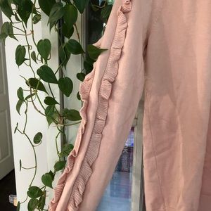 Sweet pink sweater with beautifully detailed ruffles on the arms. Like new condition.