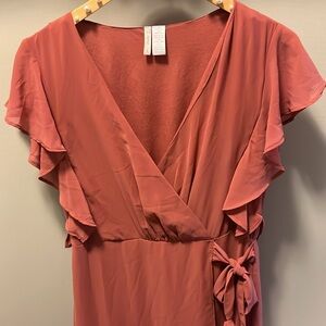 This elegant wrap dress features a flattering V-neckline and stylish ruffled sleeves. Worn once for engagement pictures