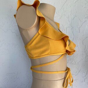 Ruffled detail. Wraps around and ties. Adjustable straps. Removable padding at bust. Rubbed material. 85% polyester/15% spandex.