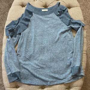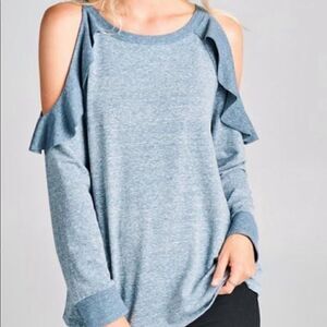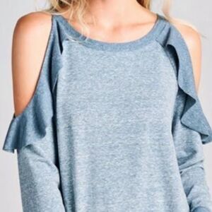Ruffled Cold Shoulder Sweatshirt. Adorable and unique cold shoulder sweatshirt with a cold shoulder. Pics with measuring tape are size M. This listing for denim blue, also available in bergundy listed separately. Made in USA.