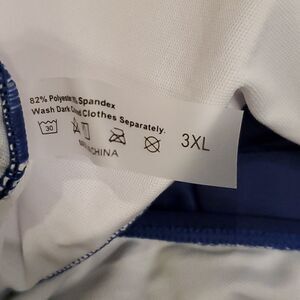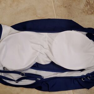 In like new condition no flaws or brand. Size 3xl. Navy blue with ruffle like front. Double strap in the back that is adjustable. Will go with a variety of bottoms. Has thin pads inside cup area. Feel free to ask questions and make offers
