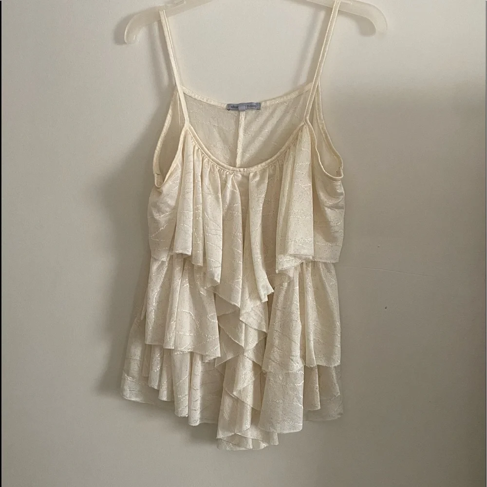 This cute ruffled top is a size small but it does stretch so it can fit like a medium. Its by Charlotte Russe. It’s super cute and cream color. It’s great under a blue jean jacket or a beautiful blazer!