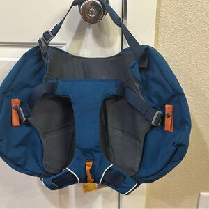 Ruffwear dog backpack in vibrant blue with orange accents. The Front Range Day Pack incorporates Ruffwear's signature radial cut saddlebags with the customer-favorite Front Range® Harness platform, making it an everyday pack staple in any dog's gear closet. Dogs can help shoulder the load thanks to the integrated padded harness and belly strap that adjust for exceptional fit and pack stability.