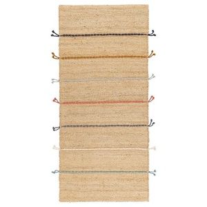 Tan runner rug with thin, colorful stripes. 2’4” x 5’ 3”. Brand new-never used