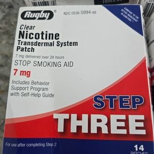 Five boxes with 14 patches in each box. Boxes are not perfect. Kind of squished in shipping. Quit smoking effectively with the Rugby Nicotine Transdermal System Patch. This Step Three patch helps you manage withdrawal symptoms with ease. These retail for 24.99 for a single box.