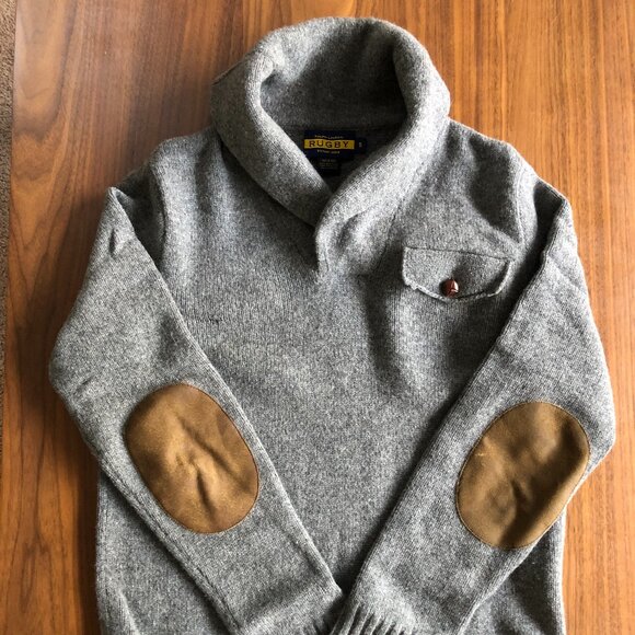 Rugby Ralph Lauren Wool Sweater Small Grey Shawl Collar Elbow Patches