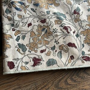The colors just didn’t work in our current home and it’s been lovingly stored in a vacuum sealed bag/container. Some light wear on the edges just in the form of some fuzzy threads (they could probably be trimmed like with a sweater shaver but I just left them). I didn’t have the space to lay it out completely flat, so the outdoors pictures are just to help show the whole rug in one frame (it was never used outdoors).