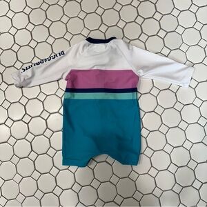 Bright and fun swimwear for baby, featuring a vibrant mix of colors. Perfect for a day at the pool or beach. Minimal sunscreen needed! Tags removed but never worn!