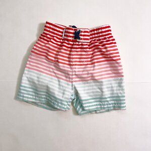 Adorable multi color striped swim trunks. Interior netting, elastic waist.