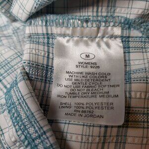 This Rugged Exposure vented blouse is perfect for outdoor activities. It's a women's medium, button-up, plaid design in green. It features roll-tab sleeves and is made from polyester.