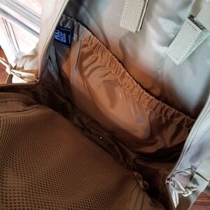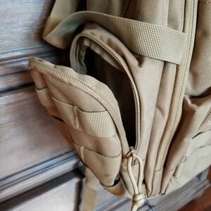 Explore with confidence using this rugged tan backpack. Designed for durability and equipped with multiple compartments for easy organization.