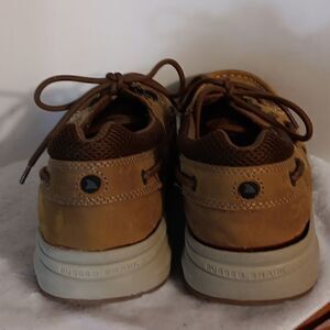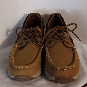 These tan leather lace up Rugged Shark "Atlantic" mens boat shoes are a size 11.5M. They have comfortable breathable water resistant antimicrobial comfort footbed system cushion pads that wicks moisture absorbs shock odor resistant insoles. In excellent condition. All offers are welcome.