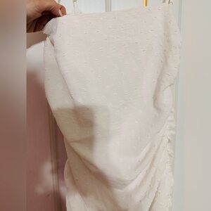 Simple ruched mini dress with adjustable straps and zip opening at back. Fabric is lightweight with slight stretch, and features a small textured spot. Fully lined.
