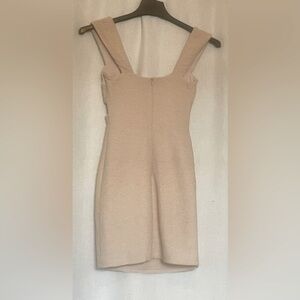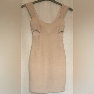 Color is nude. Lined. Cutouts at bustline. Wide shoulder straps. Hidden zipper in back. Perfect for date night, holiday dinner, wedding guest.