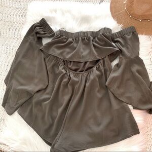 Rumor army green halter flare sleeve tie waist off of shoulder romper