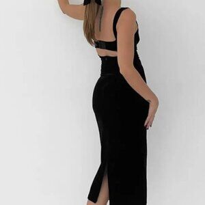 Rumored Runway black velvet midi slip dress with a back slit and square neckline. New with tags.