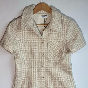 Rumored Notting Hill Mini Dress in Beige Glen Plaid. Chic and timeless tweed mini featuring a collared neckline, short sleeves, and a button-front closure. Flattering tailored fit with a structured silhouette. Perfect for preppy, office chic, or elevated fall/winter looks.