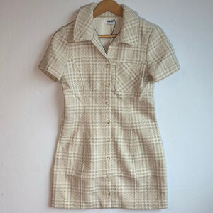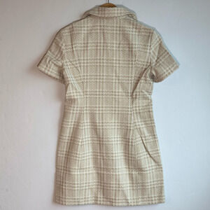 Rumored dress, tweed dress, plaid mini dress, beige dress, button front dress, collared dress, structured mini dress, tailored dress, office chic, preppy dress, fall dress, classic mini dress, neutral dress, old money aesthetic