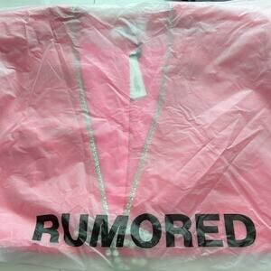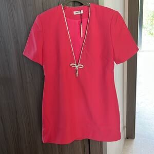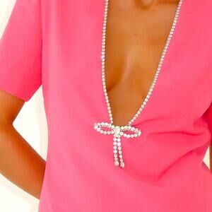 Chic pink mini dress. Deep V-neckline with pearl embellishment. Short sleeves. Perfect for a night out.