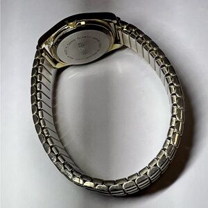 Elegant gold and silver watch with quartz movement. Features a classic round face with gold accents. Stretchable watch