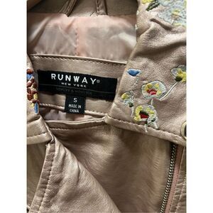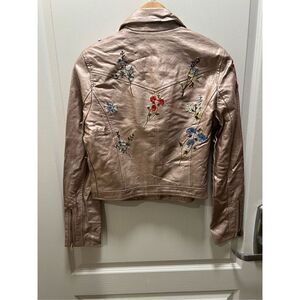 Never worn. Gorgeous Basic floral embroidered vegan leather moto jacket, brand new with tags! Lots of embroidery with zipper accents. Light pink with sheen finish.