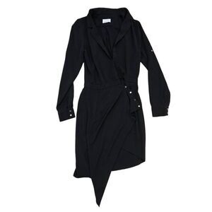Runaway, Modern, Pleated, Polyester, Spandex, Long Sleeve, Button Front, Thermal, Collared, Fall, Winter, Spring, Runaway The Label Slim Belt Shirt Dress Womens 4 Black Notch Long Sleeve Stretch.
