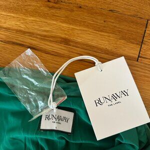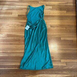 This emerald green floor-length satin dress (size M) is perfect for a formal event! It has a high neck in the front with a beautiful low-cut back. The dress also comes with a removable diamond part that can hang from the back straps.