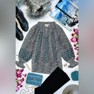 This elegant women's top features a stylish black and blue design, perfect for any occasion. The intricate pattern adds a touch of sophistication to your wardrobe. Transport yourself to the busy streets of Madrid in this très chic embroidered blouse. Show off a fun billowy sleeve, cinched with a geometric embroidered pattern while sightseeing around the city. Open V neckline silk crepe blouse with contrast embroidered panels running down the front and circling the sleeve. Cinching at wrist finished with a petit fluted sleeve. Hook and eye closure at neckline.