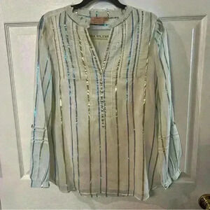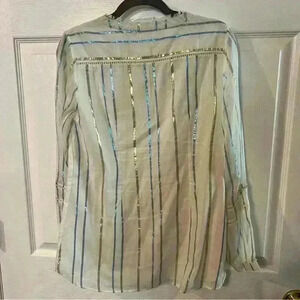 Rungolee Tunic Blouse Women Size XS White with Blue and Silver Metallic Stripes