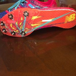 Pink, purple and blue cleats with all 6 spikes on each shoe, still had spike adjuster as well. Worn once but never ran in. Very good condition. New balance size 7 1/2