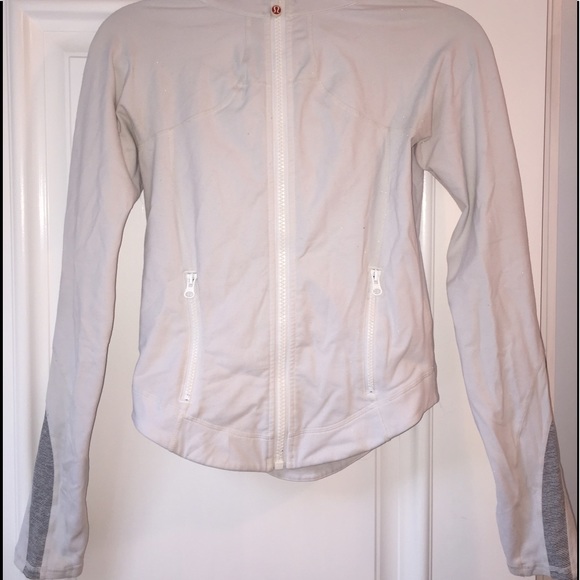 A white jacket with a few stains (Lulu bleaches well though). The zipper is red and on one side of the hoodie there is a small pocket. It is slimfititng and there are wrap around stripes on the bottom of the sleeves
